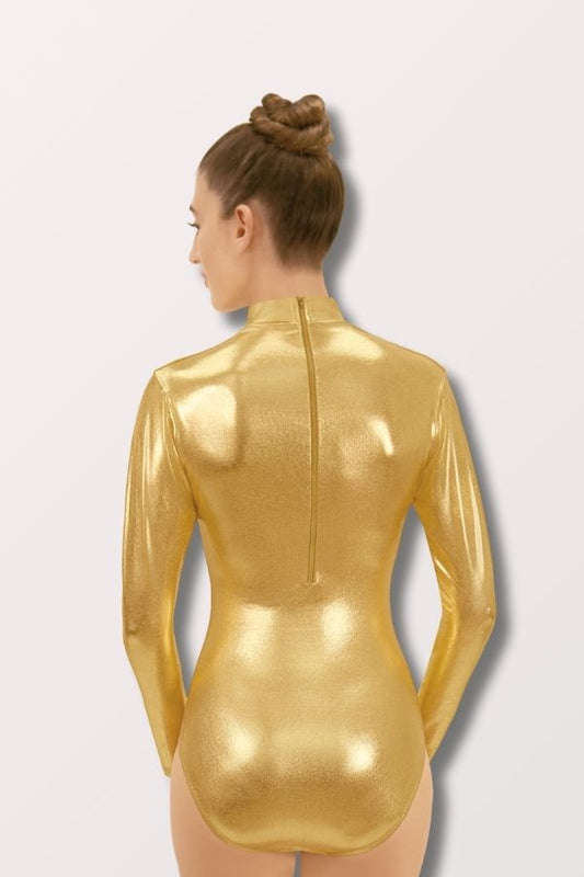 Women's Metallic Mock Neck Long Sleeve Leotard with Zipper Back - Gold